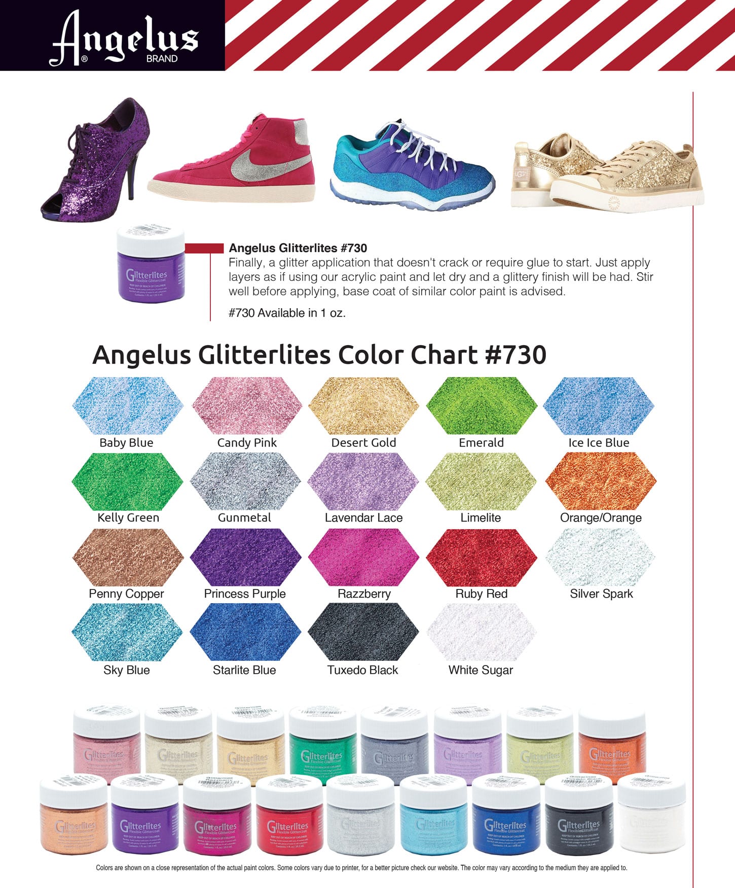 Legendarna amerykańska holograficzna brokatowa farba akrylowa do customizacji sneakersów i jeansu. Farby w kolorach brokatowych pozwalają tworzyć wyjątkowe projekty z mieniącym się efektem. Od lat stosowane przez najlepszych customizerów na całym świecie do malowania licowych i syntetycznych skór, jeansu oraz tekstyliów. Dzięki wyjątkowej formule przy właściwym zastosowaniu farba nie łamie się i nie wykrusza nawet w pracujących miejscach cholewki. Po wyschnięciu i utwardzeniu wykończenie jest odporne na uszkodzenia i zginanie. Bardzo szeroka paleta barw, dzięki której możliwości są praktycznie nieograniczone. Farby najczęściej wykorzystywane do renowacji i personalizacji butów, jeansowych katan, toreb, torebek, plecaków, portfeli, czapek, t-shirtów i akcesoriów. W odróżnieniu od wszelkich klejów z brokatem, farba Glitterlites jest bezpieczna dla skór. Rozwiązanie doskonale sprawdzające się przy rękodziele oraz okazjach specjalnych jak eventy, koncerty, śluby, imprezy. Nie stosować do zamszu i nubuku.