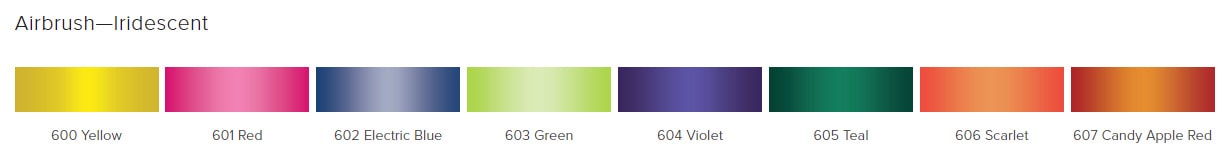 Dostępne kolory Iridescent: #600 Yellow #601 Red #602 Electric Blue #603 Green #604 Violet #605 Teal #606 Scarlet #607 Candy Apple Red