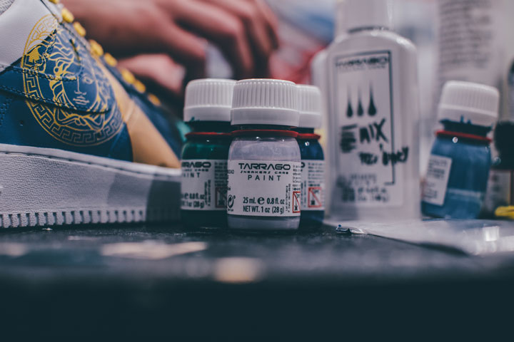 Farby akrylowe do customizacji sneakersów, odzieży i akcesoriów. Najczęściej stosowane do naturalnych i syntetycznych skór licowych oraz jeansu i tekstyliów. Właściwe zarówno do malowania detali i precyzyjnych wzorów o ostrych krawędziach, jak i całych elementów. Farba może być aplikowana za pomocą małych i dużych pędzelków i aerografu. Grupa farb najczęściej wykorzystywana przez customizerów do personalizacji butów, jeansowych katan, skórzanych kurtek, plecaków, czapek, t-shirtów i innych akcesoriów. Farby TARRAGO SNEAKERS PAINT równie dobrze spełniają swoją funkcję przy zaawansowanych i prostych renowacjach popularnych kicksów. Wyjątkowa formuła farby o wysokiej koncentracji doskonałych pigmentów przekłada się na siłę i jakość krycia. Jednym z największych atutów produktu jest jakże pożądane wykończenie o stosunkowo niskim stopniu połysku, które można łatwo regulować dedykowanymi finisherami osiągając bardzo naturalny mat, wykończenie satynowe lub dowolny stopień połysku. Większość farb akrylowych daje wykończenie w bardzo wysokim połysku, który trudno zredukować.