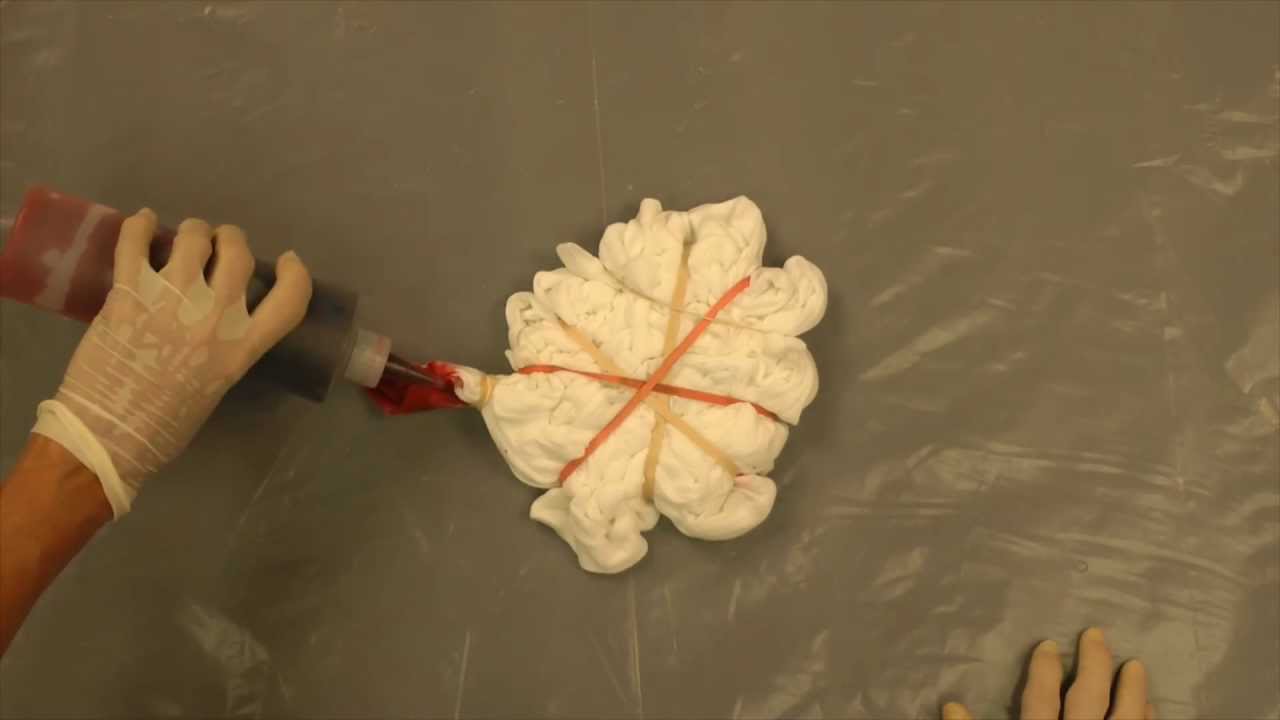 - Mieszaj kąpiel barwiącą w gumowych rękawicach ochronnych, wyciągając i wkładając tkaninę do pojemnika przy pomocy drewnianego kija. Po wyciągnięciu rozkładaj tkaninę prostując zagniecenia i wkładaj ponownie do kąpieli w innej konfiguracji.