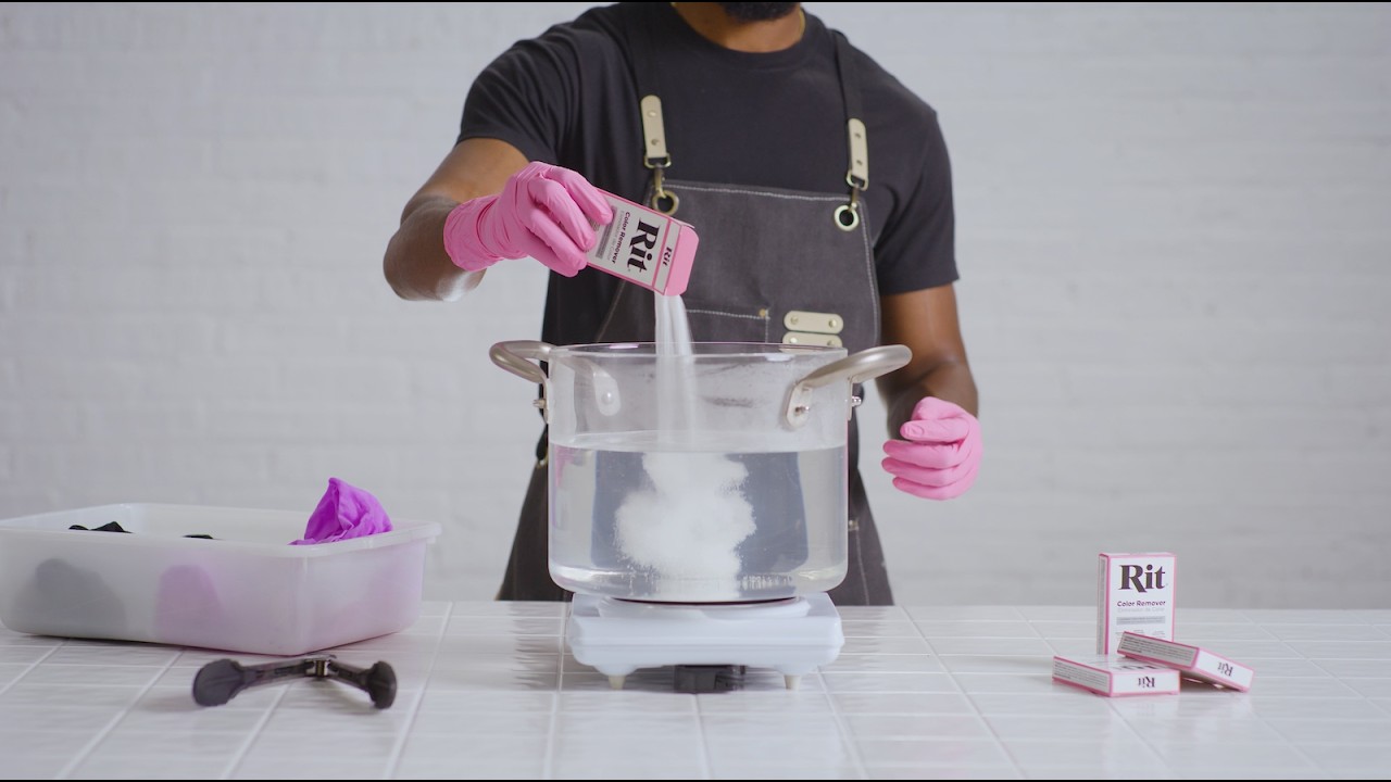 - Zmieszaj wybielacz RIT Color Remover z 950ml gorącej wody. Jeśli usuwasz kolor z małego wsadu, użyj 2 opakowań Color Remover. Jeśli usuwasz kolor z dużego wsadu, użyj 3 opakowań Color Remover. Jeśli usuwasz kolor z bardzo dużego wsadu, użyj 4 opakowań środka Color Remover.